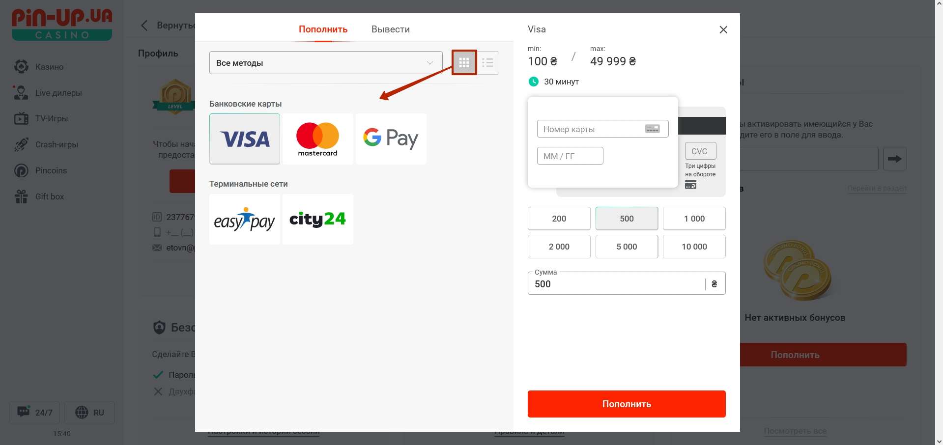 Внести депозит у Pin Up Casino Україна можна з банківських карток, сервісу Google Play або через термінали EasyPay, City24. Мінімальна сума поповнення – ₴100, максимальна – ₴49,999. Межі при депозиті з ATM буде відображено на моніторі терміналу. Комісія при поповненні рахунку відсутня, гроші зараховуються протягом 30 хвилин.