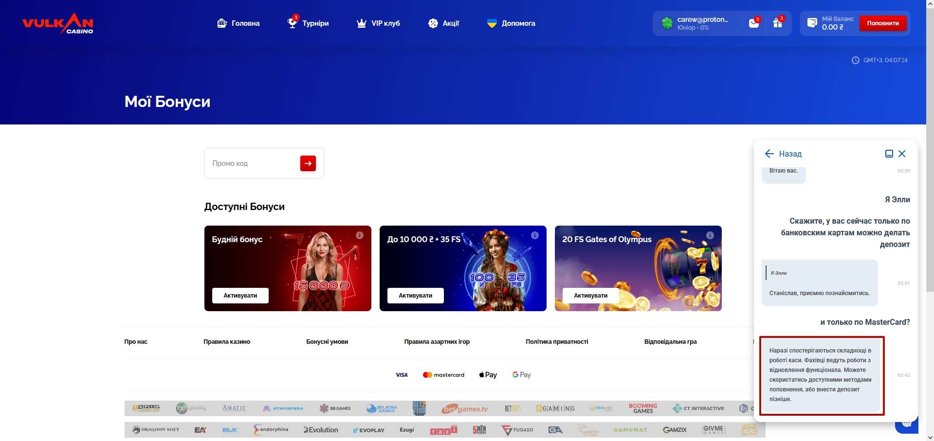 Vulkan Casino: тимчасові складнощі навіть із депозитом, переходимо на MasterCard