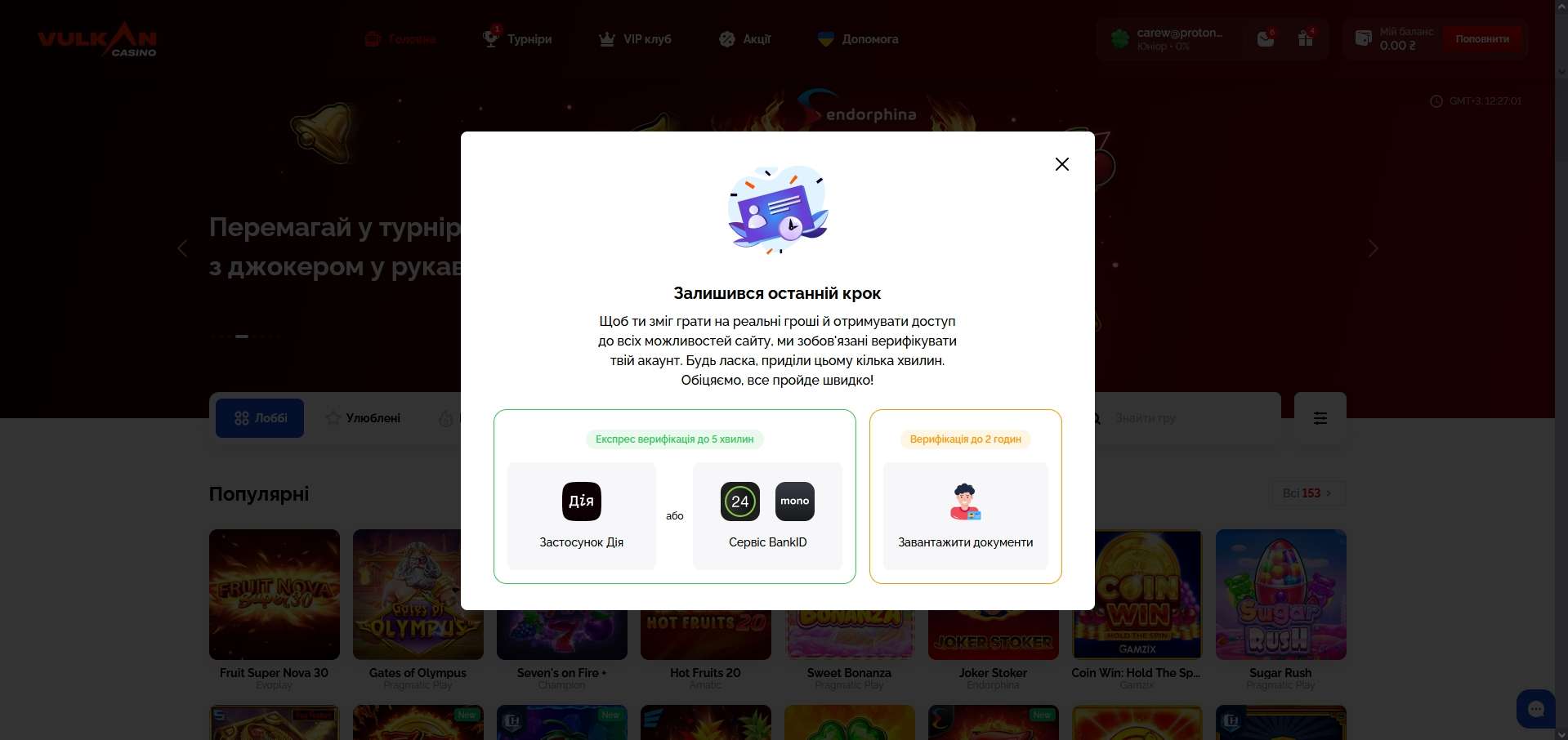 Це ще одна обов’язкова умова для гри на гривні у Vulkan Casino. Верифікація принесе гемблеру бездепозитний бонус, відкриє режим грошових ставок на слотах та розблокує виведення виграшів. Додатково, тільки після підтвердження особи можна потрапити до профілю облікового запису. Спроба зробити це раніше, призводить до появи вікна, яке описує можливості, що відкриваються верифікацією.