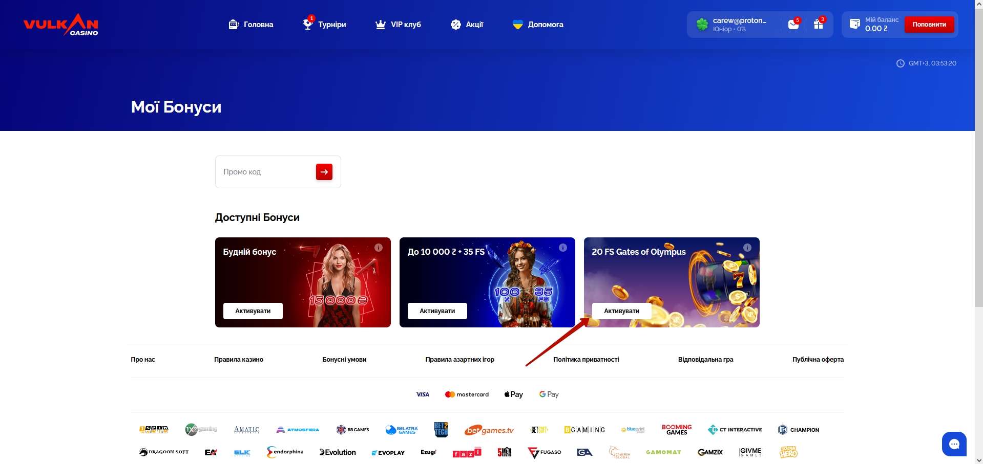 Перед початком процесу підтвердження особи обов’язково активуйте бездепозитні фріспіни в бонусному розділі облікового запису.