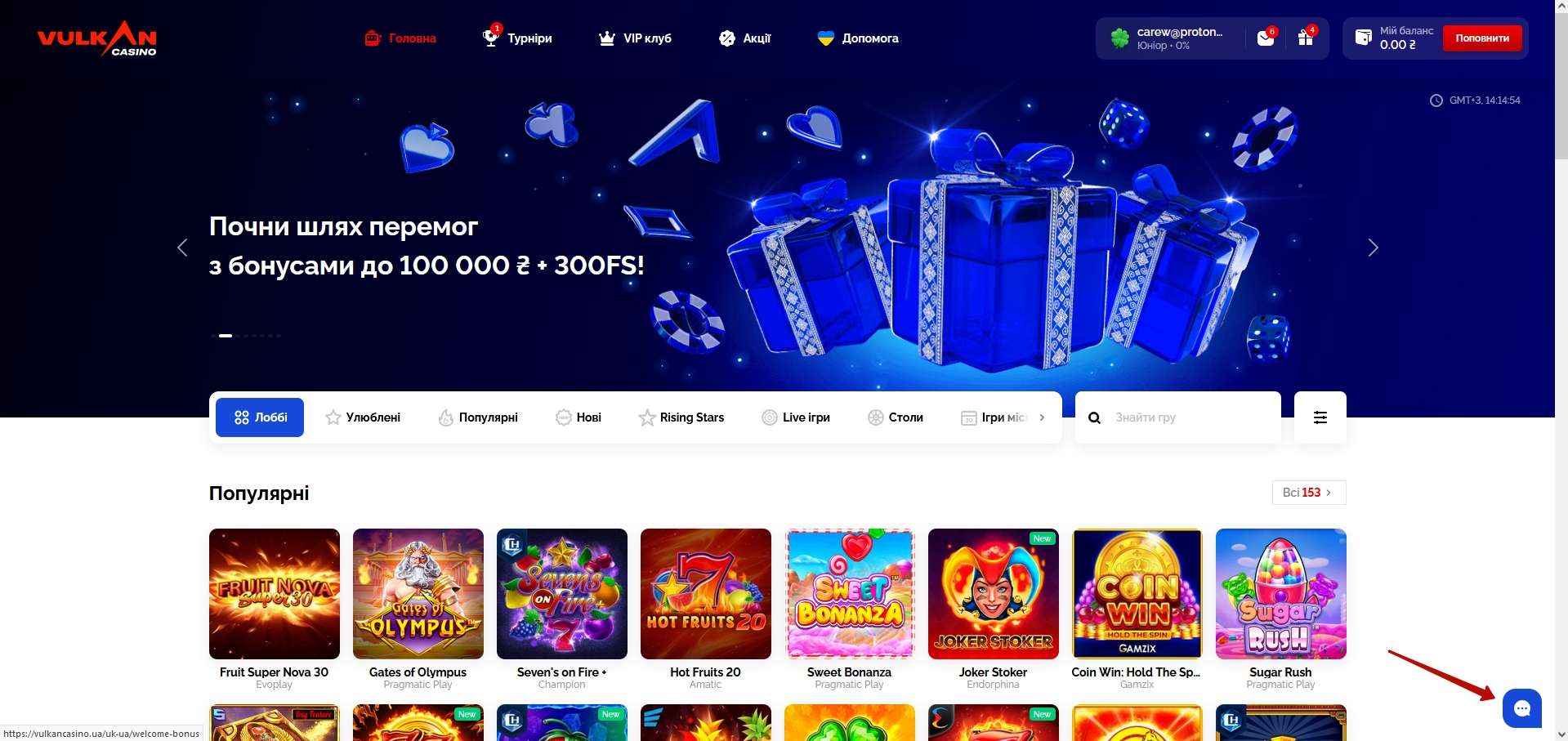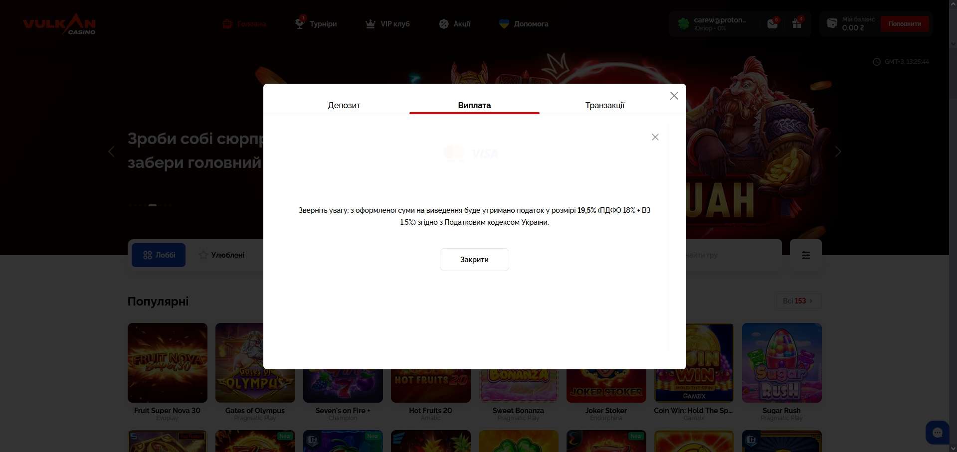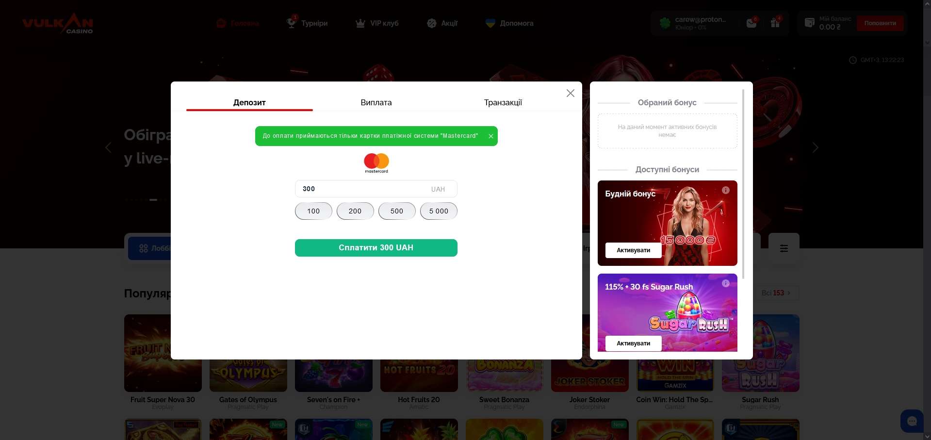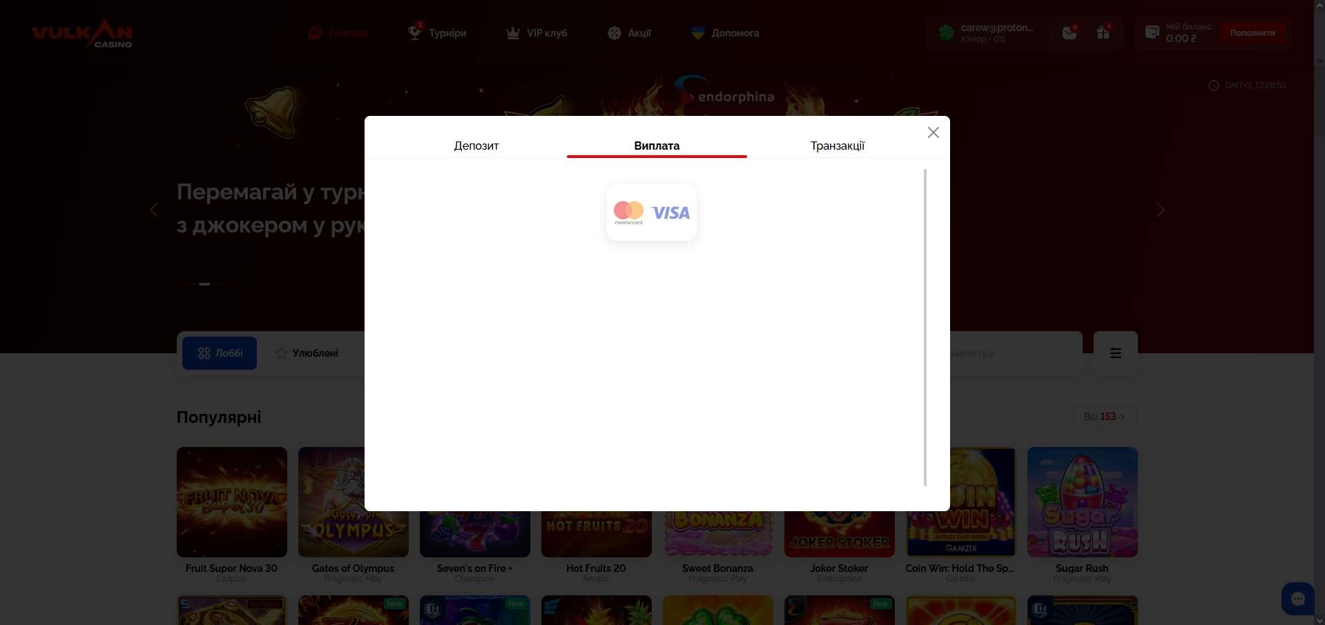 З листопада 2023 року у Vulkan Casino залишився єдиний сервіс під депозити та виведення – банківські картки MasterCard.