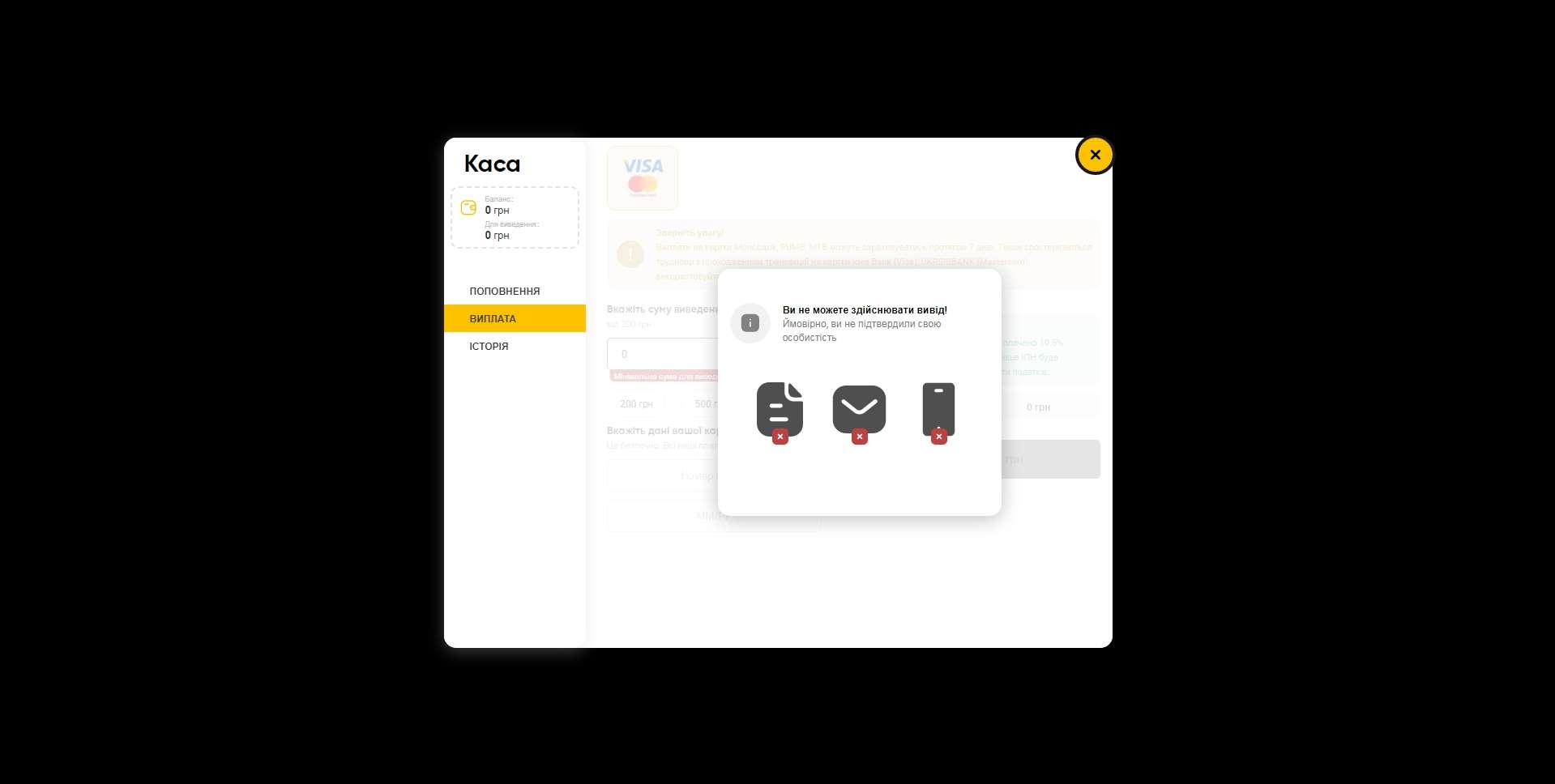 Наконец, при посещении вкладки «Выплата» в кассе аккаунта, создание заявки на вывод денег заблокировано аналогичным сообщением.